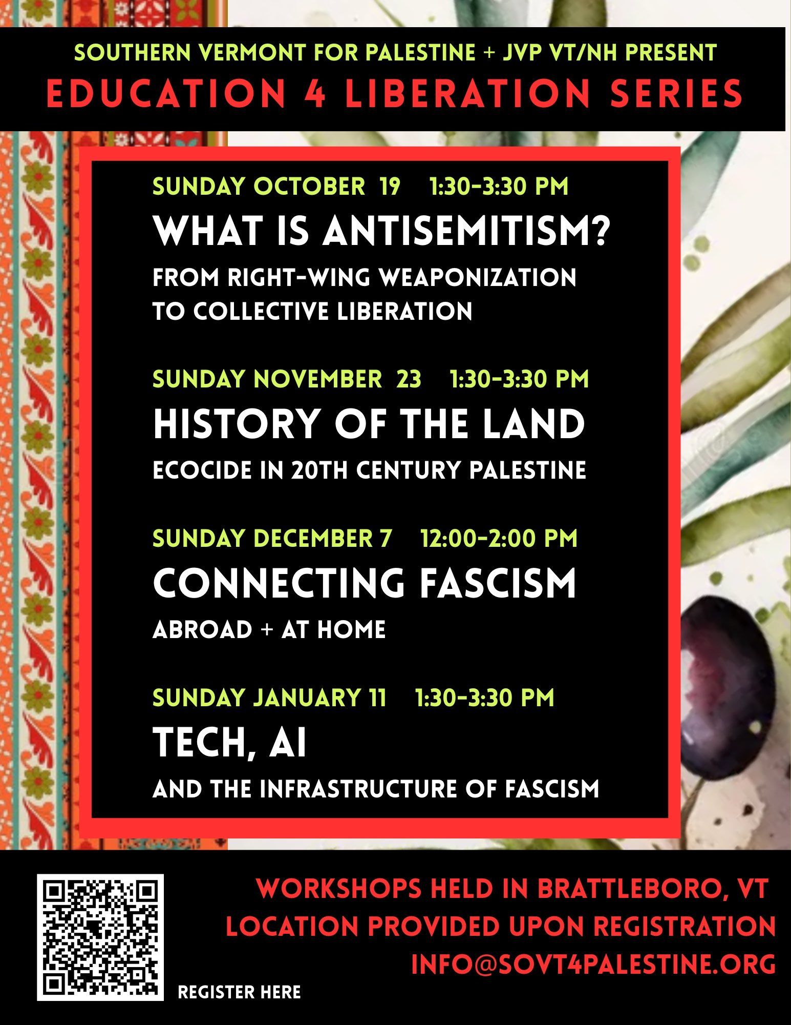 Beginning on Sunday, October 19 - BRATTLEBORO from 1:30-3:30 PM - Education 4 Liberation Series a four month series of workshops presented by Southern Vermont for Palestine and JVP VT/NH. Workshop I - What is Antisemitism; From Right-Wing Weaponization to Collective Liberation.